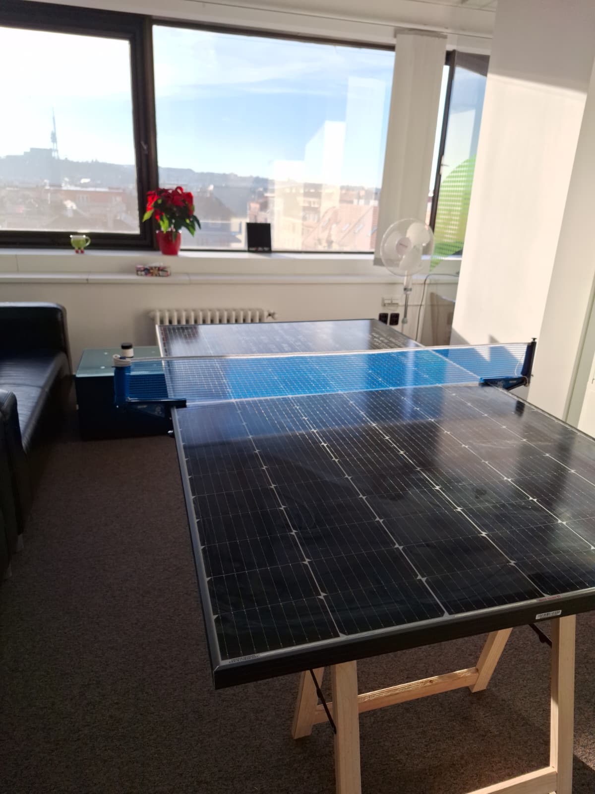 Máme tu krásné otevřené prostory, které jsou oddělené skly, kdy v první části se nacházejí gauče a úložné prostory a tam jsme dneska postavili ping pongový stůl. Podložka je z fotovoltaického panelu, jen je škoda, že ne Aiko.